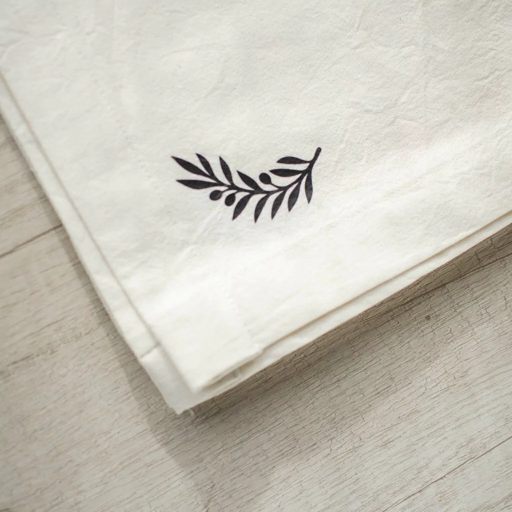 El diseño tiene borde ancho en las terminaciones y una ramita de olivo en cada esquina, estampada en color negro.